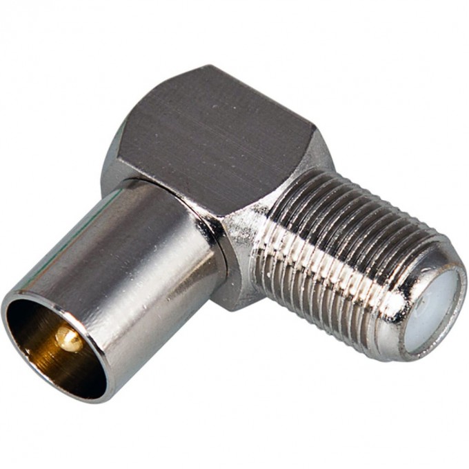 Переходник предназначен для соединения коаксиального кабеля (предварительно установленным F-разъёмом) с ТВ оборудованием, таким как (розетки -ТВ, ресиверы, приставки DVB-T2, антенны-ТВ и т.д.). Отличительной особенностью переходника является угловая форма, что позволяет подключить кабель к оборудованию под прямым углом 90°. Изготовлен переход из никелированного металла, контакты выполнены с высокими антикоррозийными свойствами.