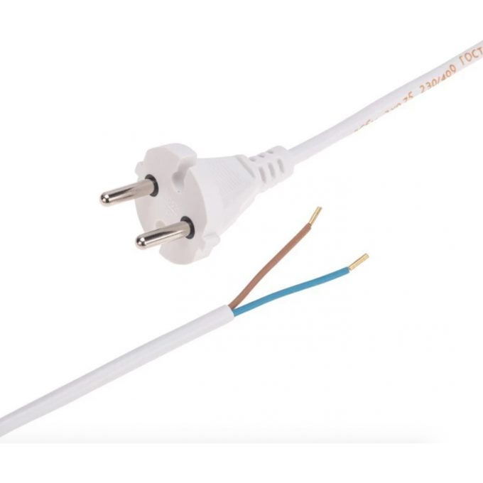Провод ПВС сечением 2х0,75 мм² номинальным током 10 А с подготовленными (зачищенными) контактами укомплектован литой неразборной плоской вилкой (Евро).