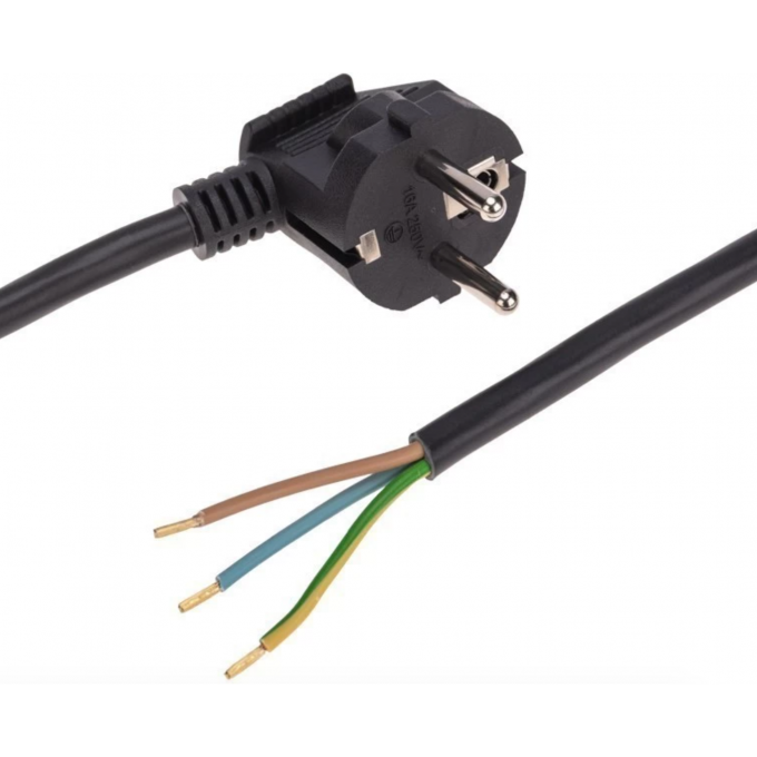Провод ПВС сечением 3х1,5 мм² номинальным током 16 А с подготовленными (зачищенными) контактами укомплектован литой неразборной угловой вилкой (Евро).