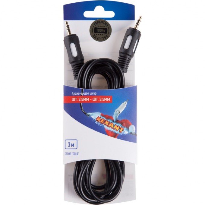 Шнур 3.5 Stereo Plug - 3.5 Stereo Plug 3М (GOLD) REXANT предназначен для передачи аналогового аудиосигнала и широко применяется в любых акустических системах. С обеих сторон шнура располагаются штекеры разъема 3.5 Stereo. Шнур используется для совместной эксплуатации домашней и профессиональной аудиоаппаратуры (микрофоны, электронные музыкальные инструменты, плееры, усилители звука, телевизоры, видеоприставки, мобильные телефоны и т.д.), имеющей разъемы такого типа. Разъемы выполнены из лёгкого и прочного пластика, а контакты штекеров покрыты слоем золота, нанесенного по технологии вакуумного напыления для улучшения качества передачи сигнала. Длина шнура составляет 3 метра. Профессиональный уровень надежности достигается благодаря применению качественных материалов и высокотехнологичного уровня исполнения шнура.