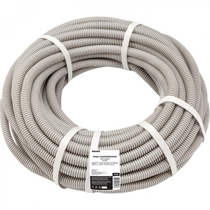 Труба гофрированная из ПВХ с зондом, черная Ø 50 мм (бухта 15 м/уп.) REXANT. Гофрированные трубы (гофра) из ПВХ – профессиональная кабеленесущая система для скрытой/открытой электропроводки в стенах (по стенам), потолках (по потолкам), полах жилых, административных и промышленных помещений.