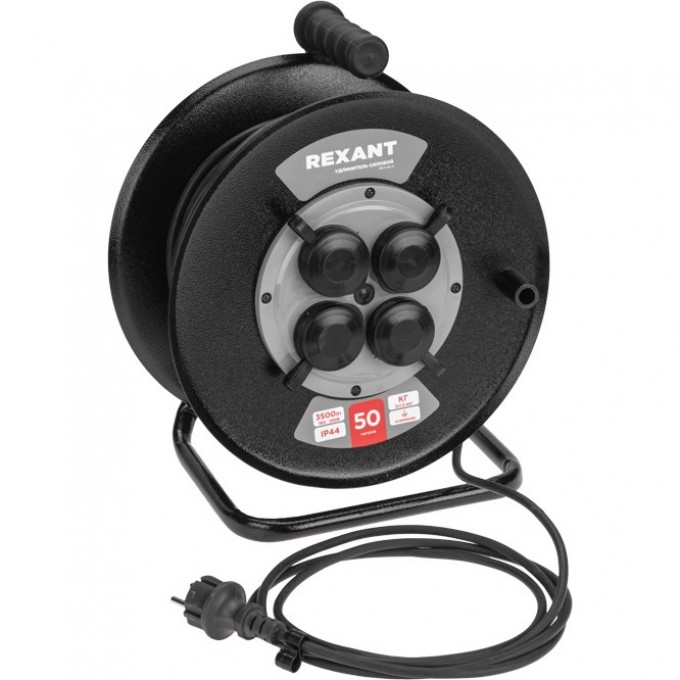 Удлинитель силовой REXANT КГ на катушке 4 гнезда, с/з, 50м, 3х1,5мм², IP44 с выключателем, c защитными крышками, металлическая катушка 13-5013