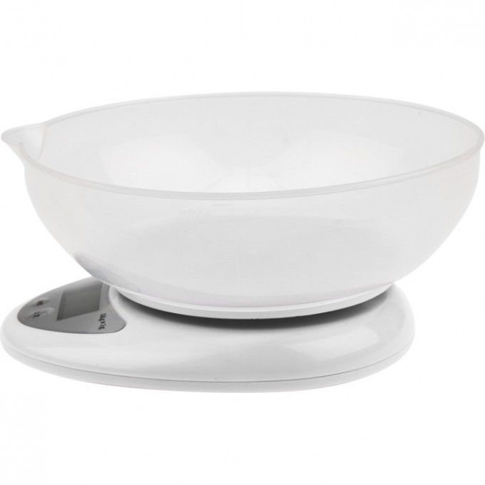 Модель оснащена платформой для взвешивания, а также съёмной небьющейся чашей. Чаша выполнена в классическом дизайне и имеет вместимость 900 миллилитров. На чаше имеется шкала с делениями по 100 мл и носик, для аккуратного слива жидкостей. Корпус весов удобно помещается в чашу на время хранения или перевозки.