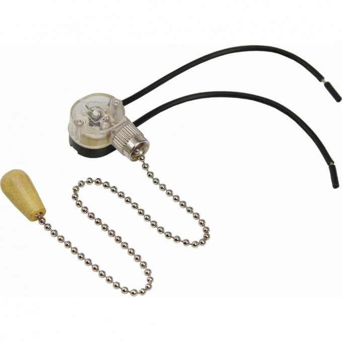 Выключатель для настенного светильника с хромированной цепочкой, проводами и деревянным наконечником.